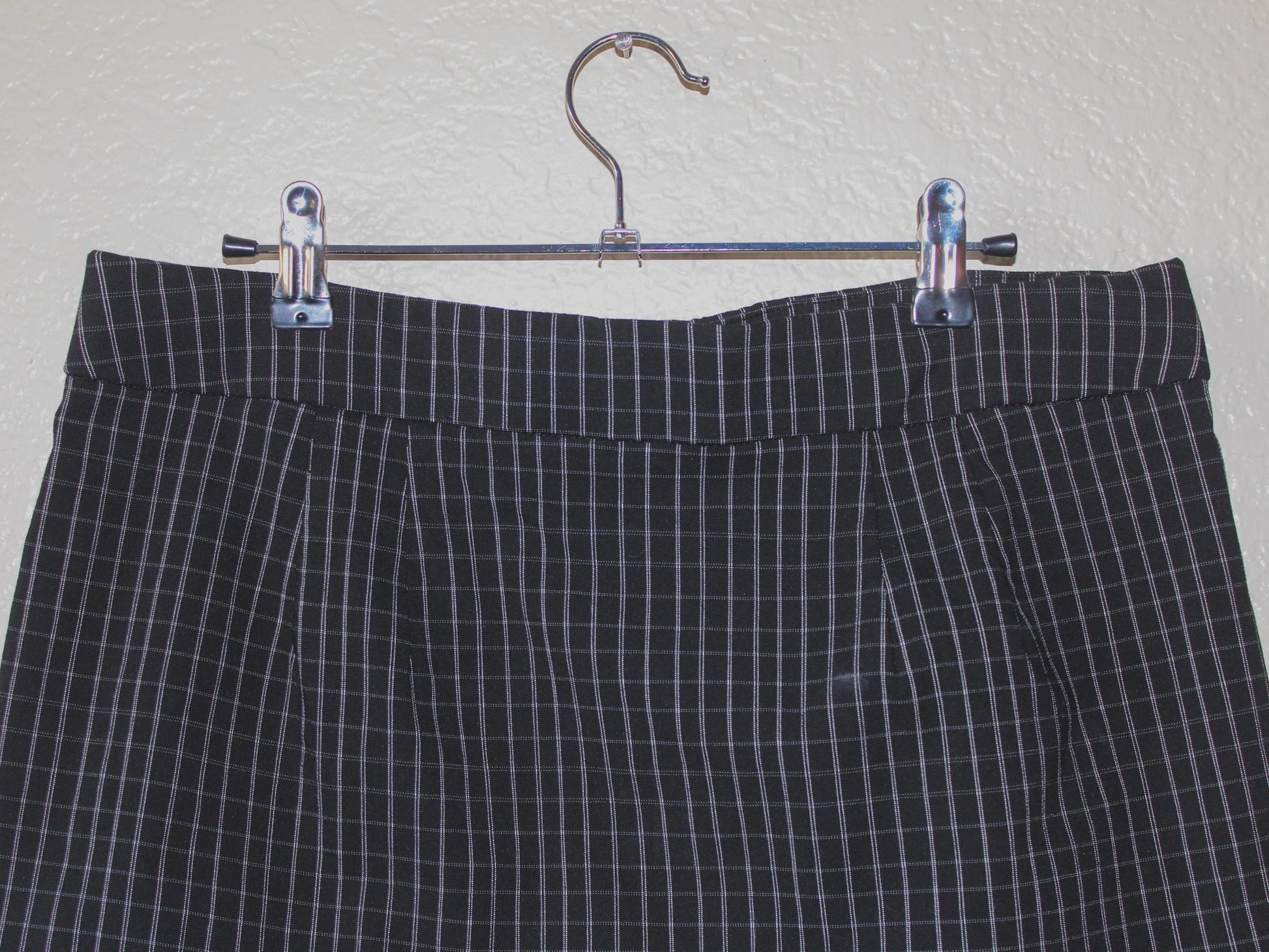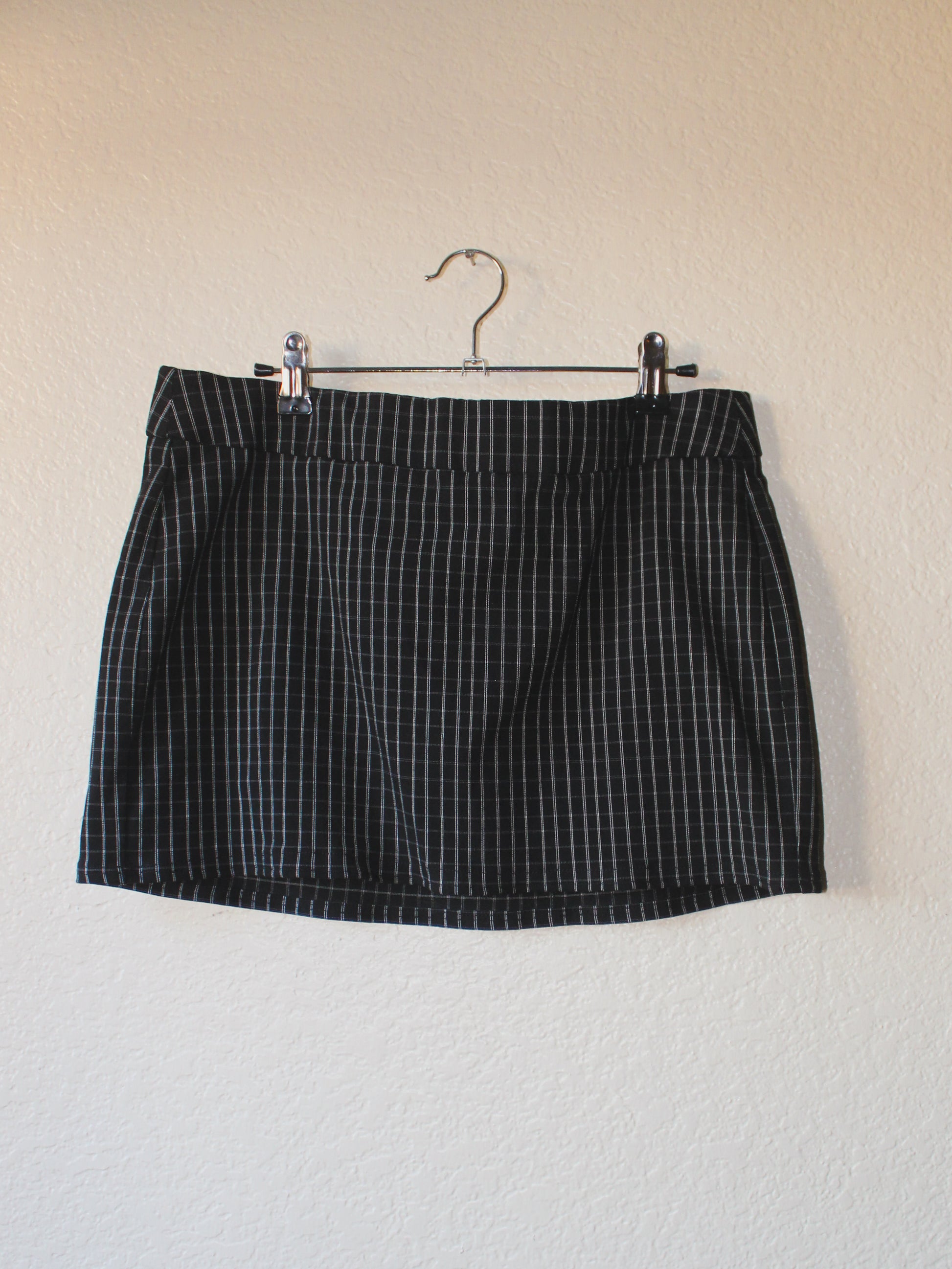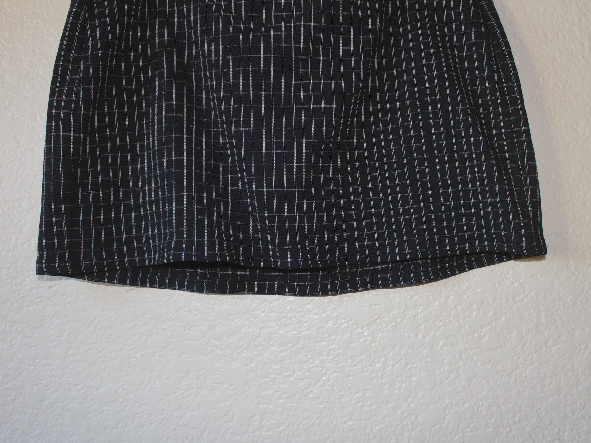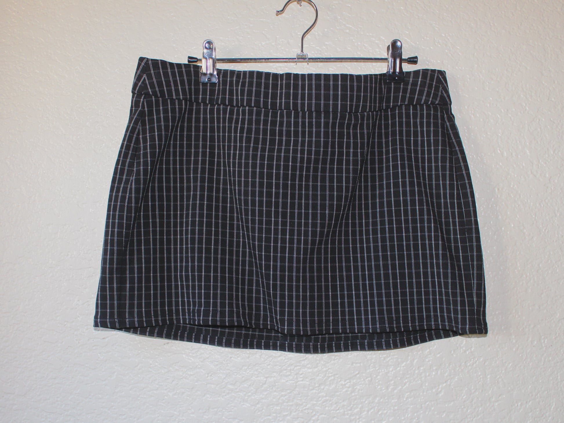 Reworked from a pencil skirt into a mini skirt by me. Elastic waist band and grid pattern.