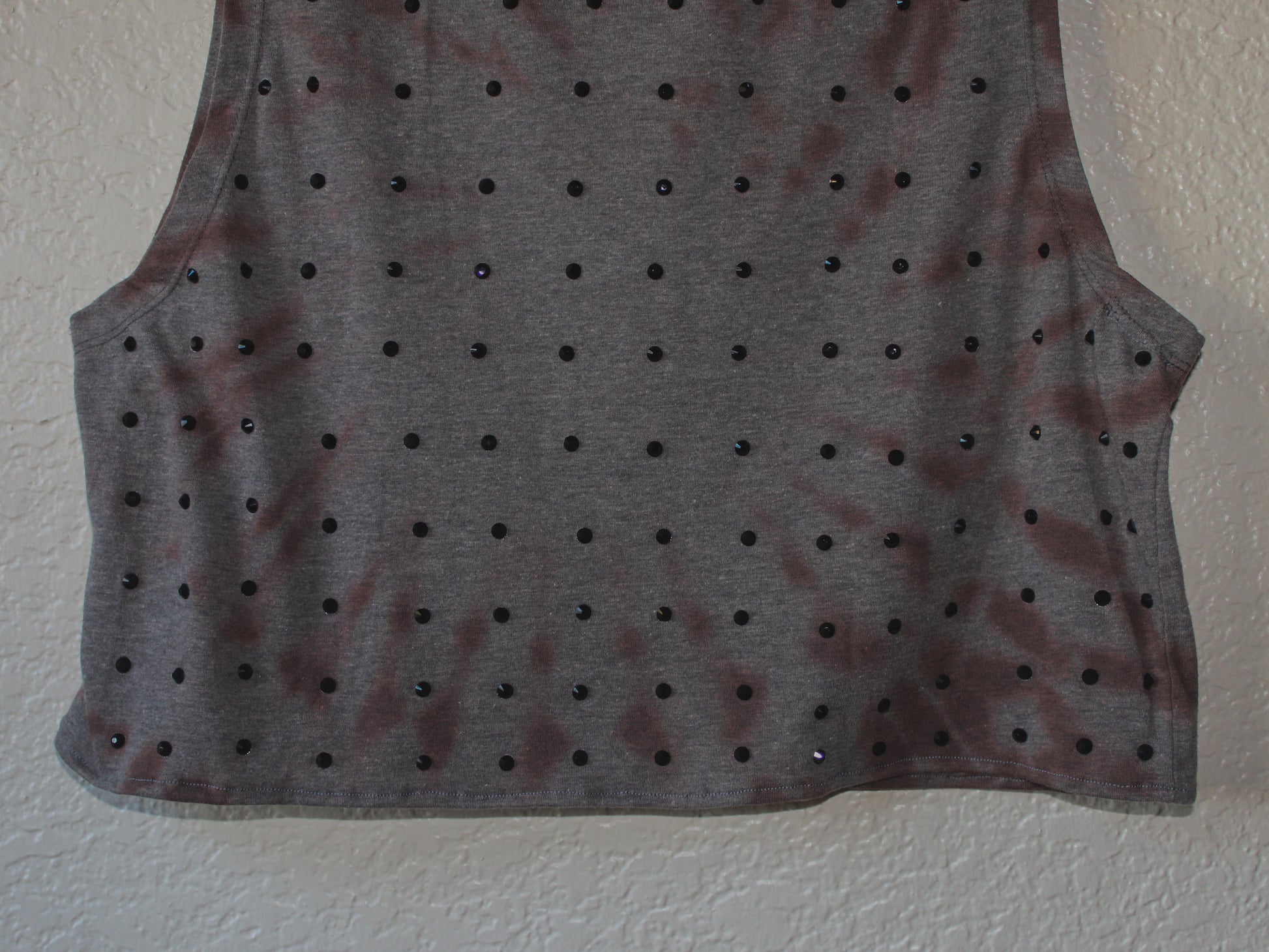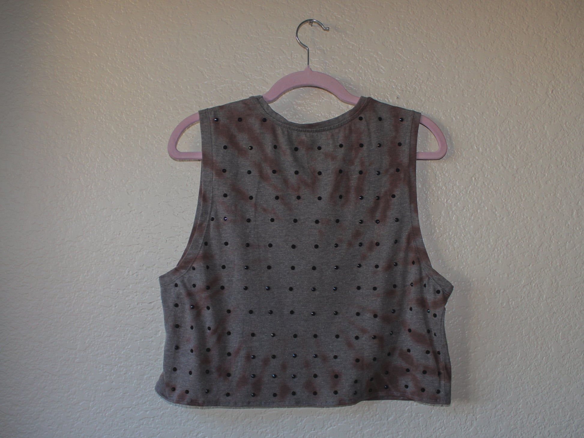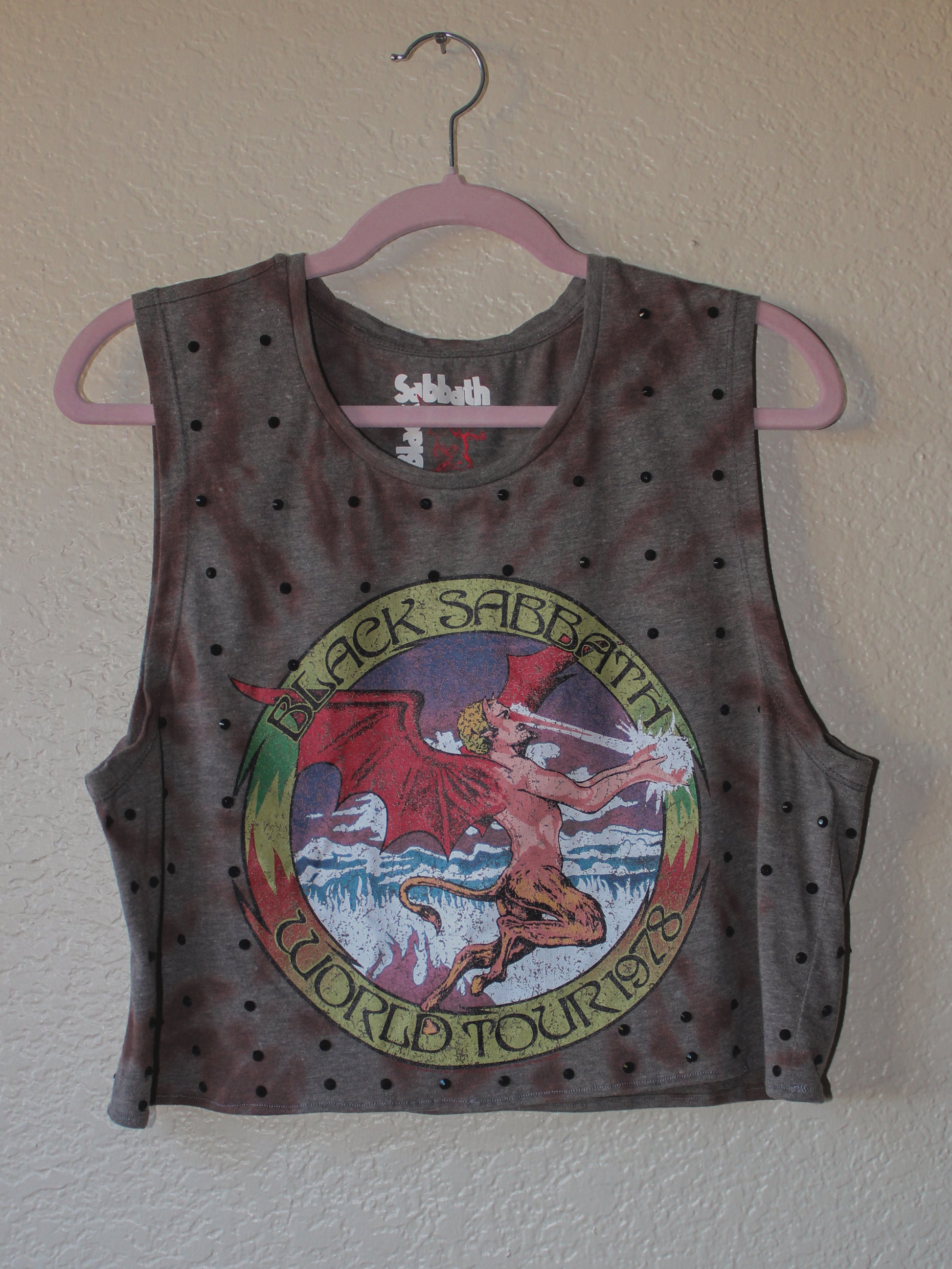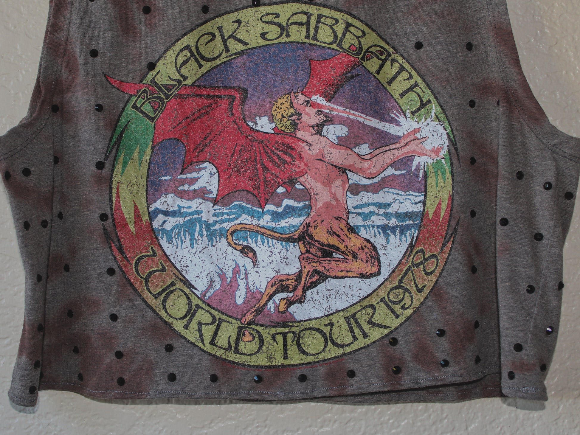 Rock out in this one-of-a-kind cropped tank featuring the iconic Black Sabbath logo bedazzled with shimmering rhinestones. Hand-bleached for a unique, vintage-inspired aesthetic, this reworked piece transforms a classic band tee into an edgy statement piece. Perfect for music lovers who want to turn heads with their style!