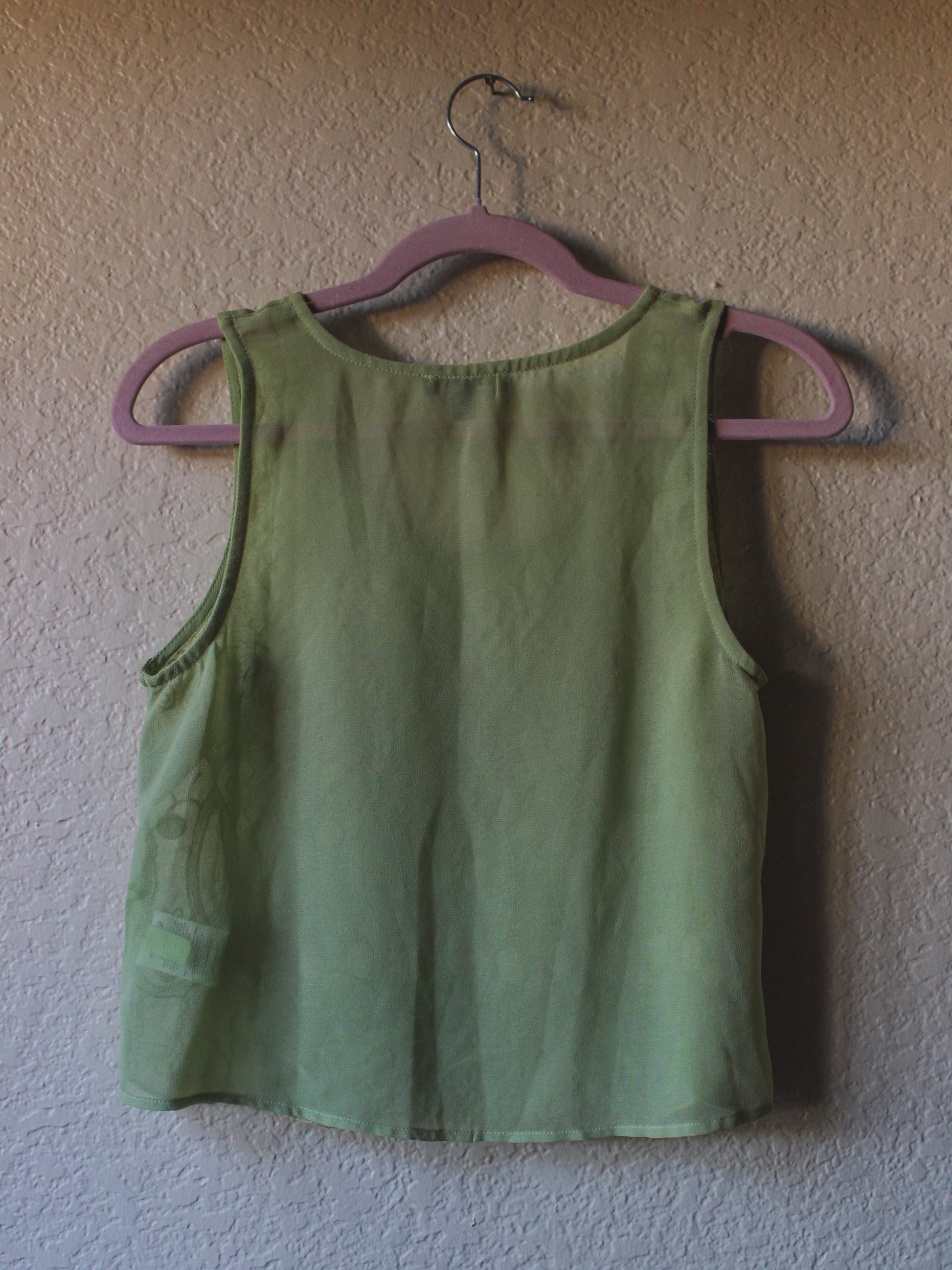 Hand-dyed in a beautiful light green, this reworked beaded express piece is pure magic. The delicate beading adds just the right amount of sparkle without trying too hard. Perfect for layering or going solo, it's the kind of find that makes you feel good about what you're wearing. Sustainable style never looked so good. Tag read XS