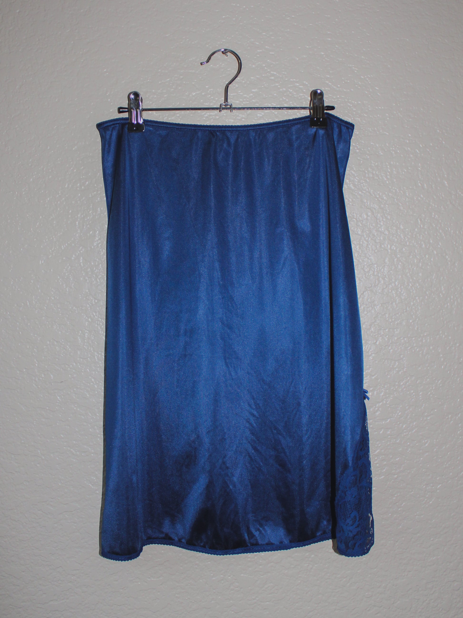 Vintage navy blue JC Penny slip skirt made in the USA. With a slit and delicate lace detailing.